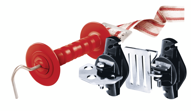 - Includes: handle, 2 x Wood Post Pinlock Insulators, buckle, activator and 5 m of white/red Premium Gate Tape